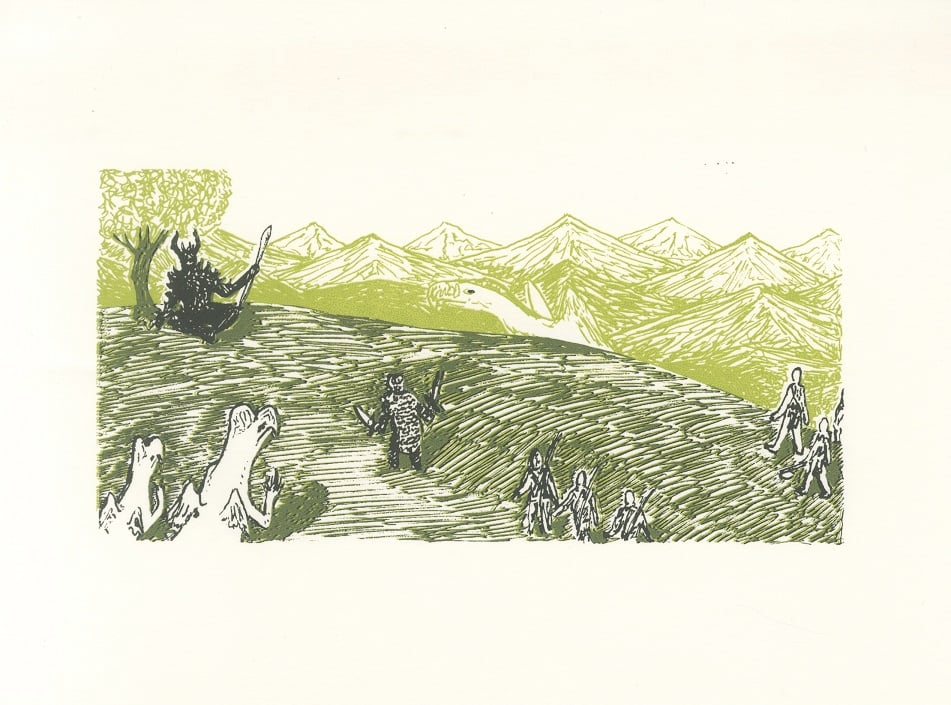 Two layer screenprint of the gritty fantasy novel The Red Knight; showing the villian, Thorn meeting and intimidating his lieutenants, all creatures drawn with a great mix of influence from european folklore combining in a very unique way.